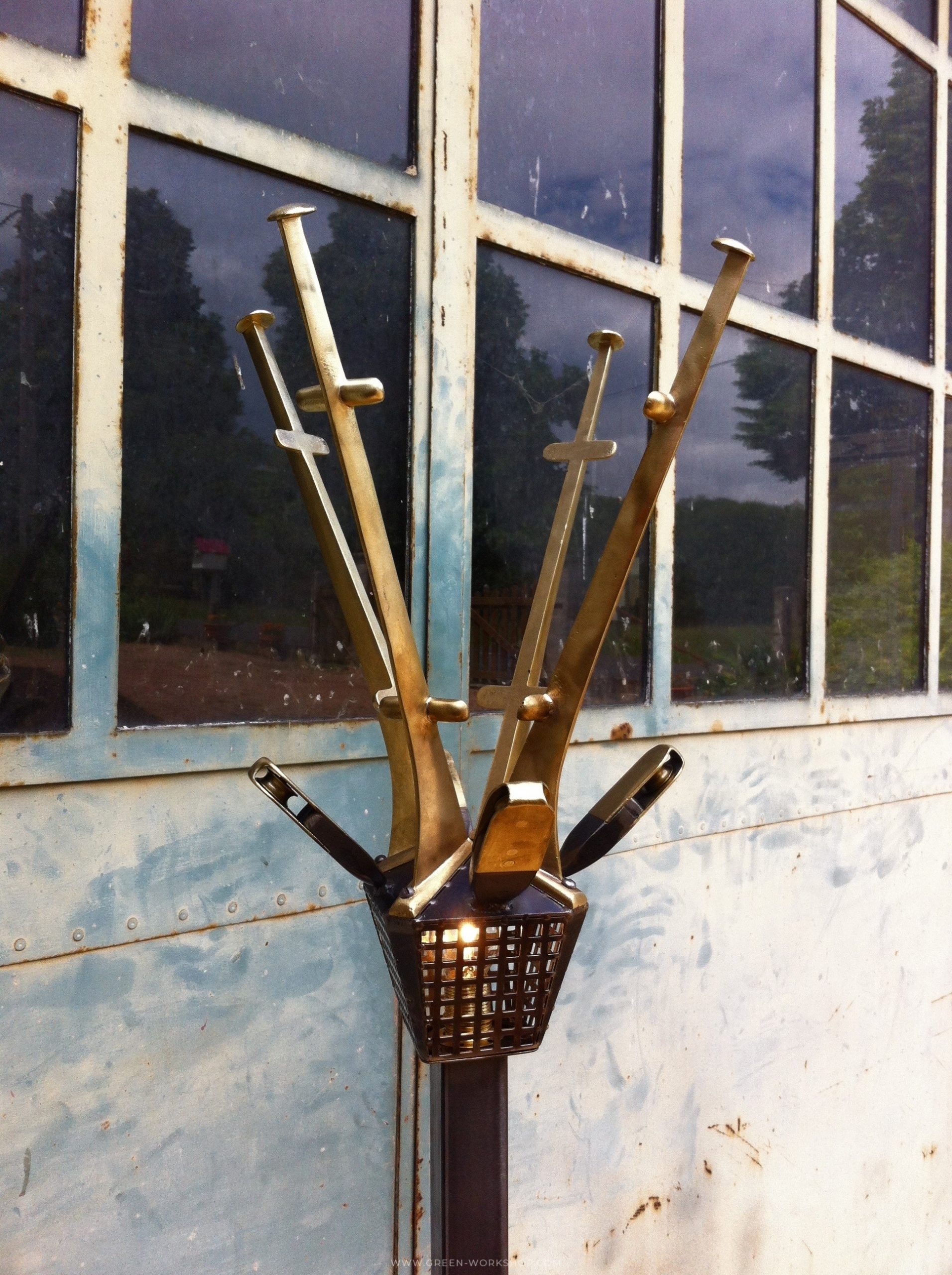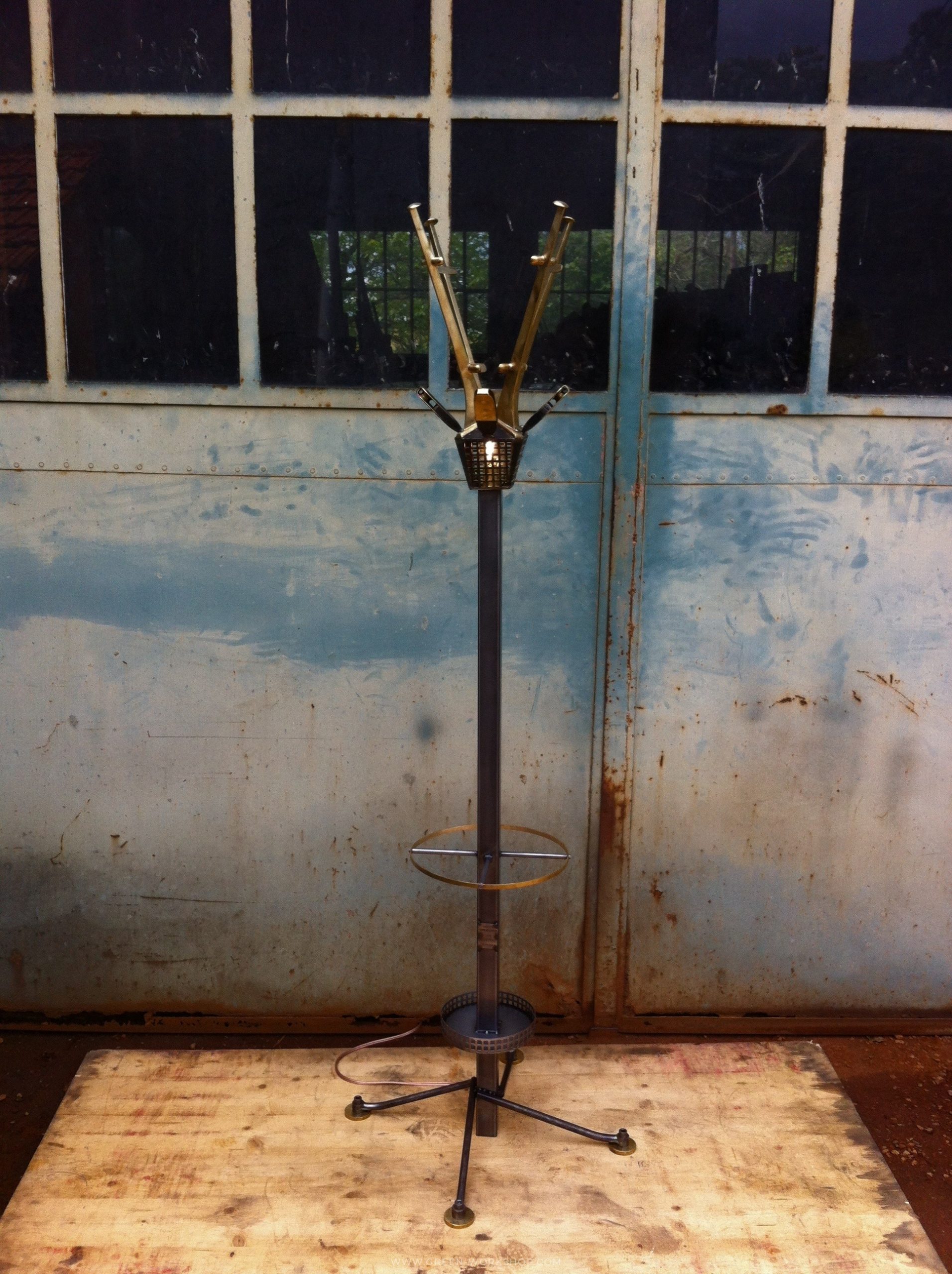 The Holder est un ami brillant et courtois réalisé en acier et laiton qui vous déchargera de vos manteaux et accessoires, conçu à partir d’anciennes équerres de rayonnage et de barres de direction d’une Citroën 2 Chevaux.